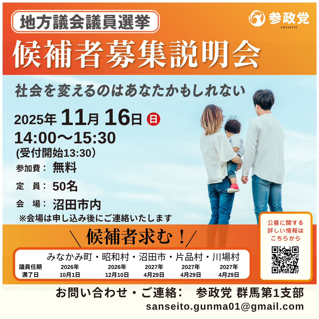そんな想いを持つあなたに地域から日本を変えるチャンスがあります! 参政党では、立候補を検討している方を対象に公認候補希望者説明会を開催します。